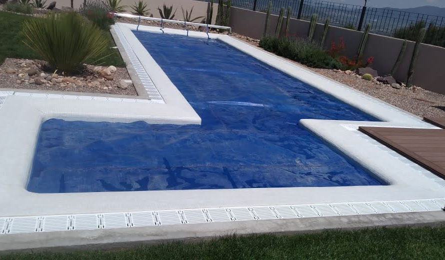Dos rectangulos colindan para darle vida a esta alberca que en su parte mas pequeña se toma como el acceso desde el deck para entrar a una playa con 30 cm de profundidad donde pueden jugar niños sin riesgo, al entrar al rectangulo mas grande la profunidad aumenta a 1.40 mt.